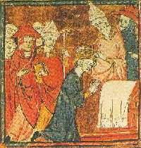 | | Le pape Léon III couronnant Charlemagne | Enfin, on ne peut pas omettre de mentionner la détérioration des rapports entre Byzance et la papauté, et ce, en dépit de l'attachement des pontifes romains à la défense des images. Cette défense des images ne suffit effectivement pas à compenser ce que Byzance regarda comme son plus grave échec en Occident, un véritable crime de lèse-majesté. Jugez-en plutôt : le 25 décembre 800, sous le règne d'Irène à Byzance, Charlemagne fut couronné "empereur Auguste", par le pape Léon III. Ce fut une véritable usurpation aux yeux des Byzantins et un élément capital dans le processus de séparation entre l'Occident et l'Orient, car la papauté montrait ainsi qu'elle avait choisi l'Occident.